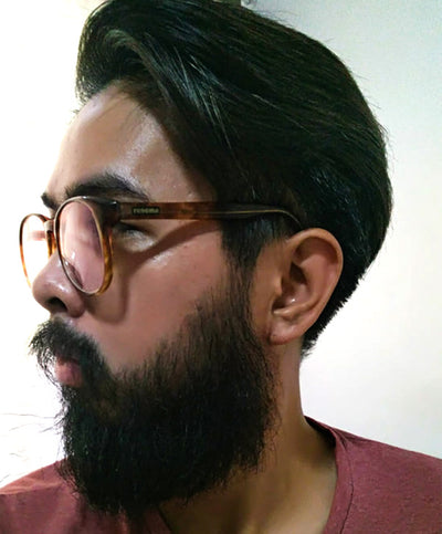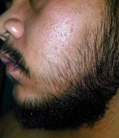 - Since we are going to apply on both left and right of the face area, Apply 3-4 sprays/pumps on each side and spread up to your mustache and down to your chin and jawline.